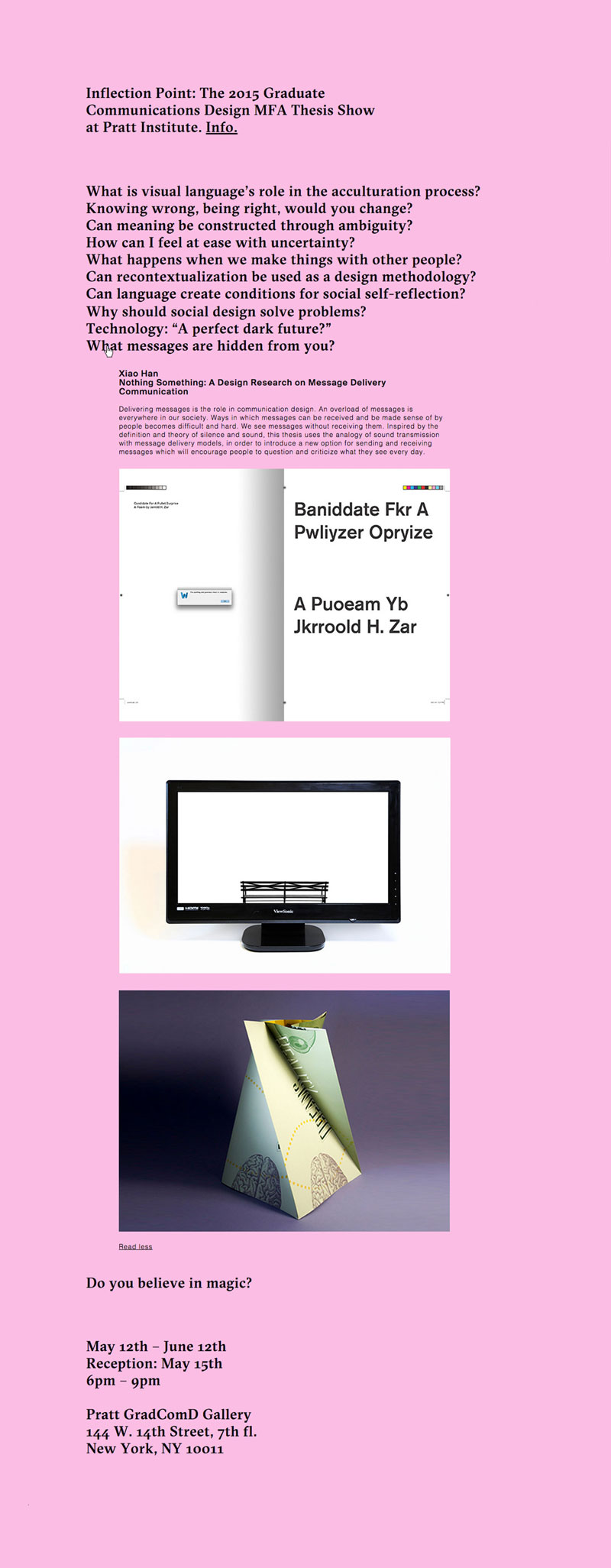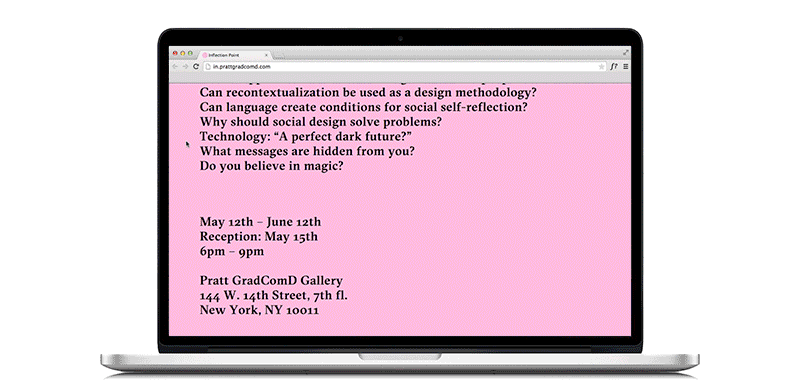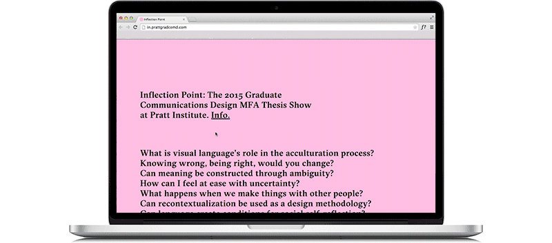 Website concept and design for "Inflection Point," the thesis exhibition of Pratt Institute's 2015 MFA Communications Design graduating class. Done in collaboration with Juan Carlos Rodríguez-Rivera, Xiao Han, and Zhitong Zeng.