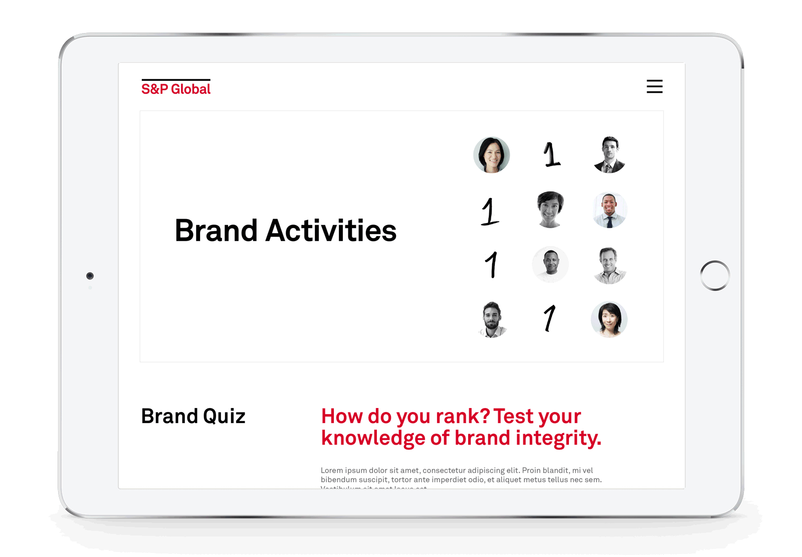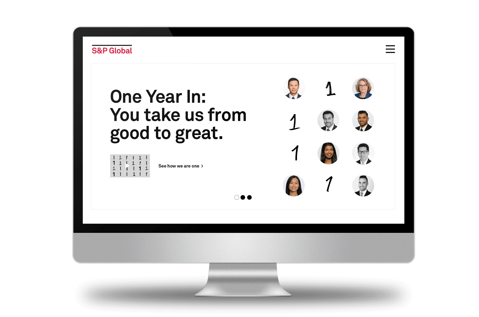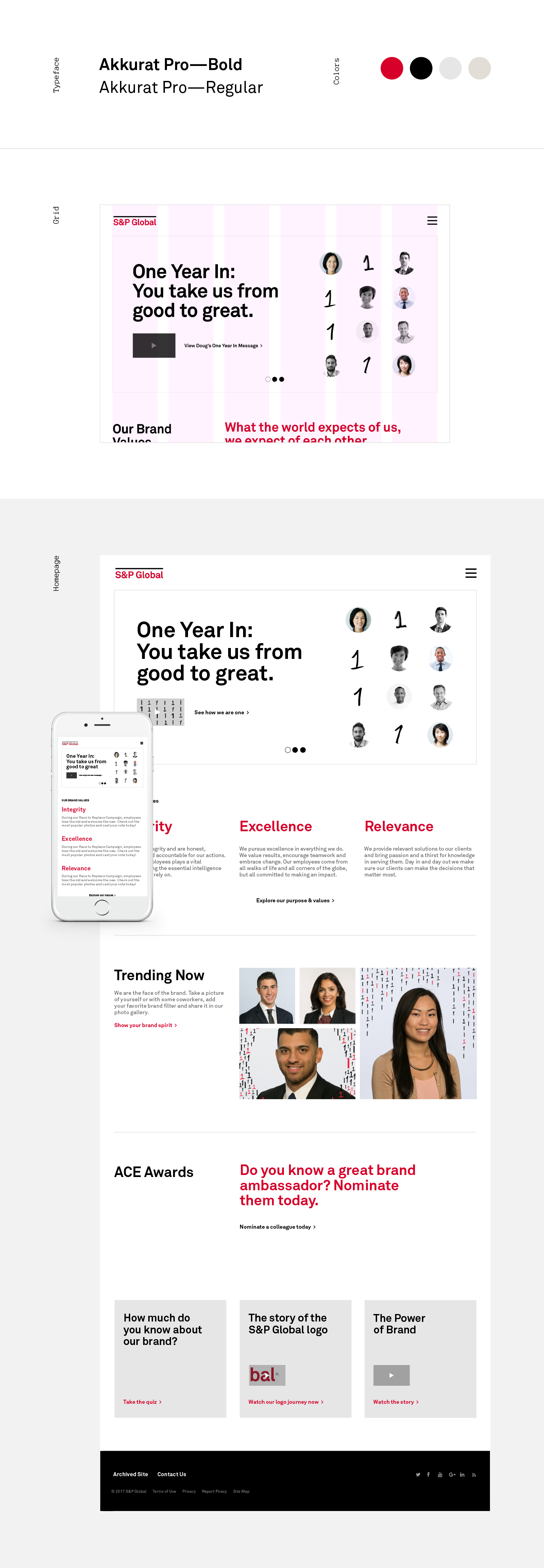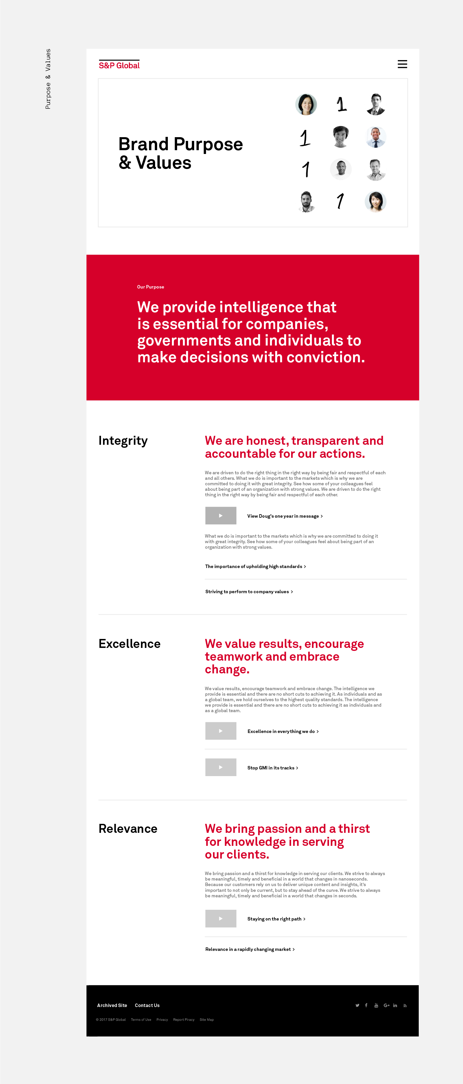 The branding team at S&P Global planned a campaign to celebrate the one year anniversary of the new S&P brand. The focus of the "One Year In" campaign was to showcase employee contribution as well as diving into the brand's values and purpose.
