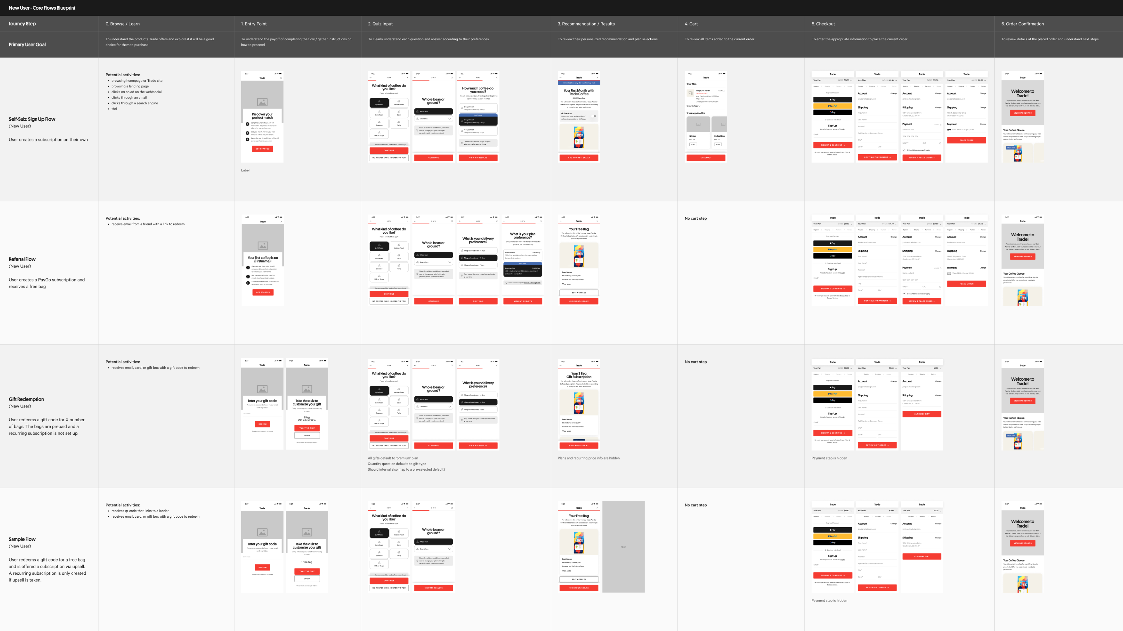 Trade had five different experiences for customers to purchase a subscription. Most of these flows were years old, inconsistent in UX, and challenging for customers. These inconsistencies also made it difficult to iterate on these experiences to achieve Trade’s new growth goals. For the customer, it created an overly complex and confusing experience without a clear path forward.