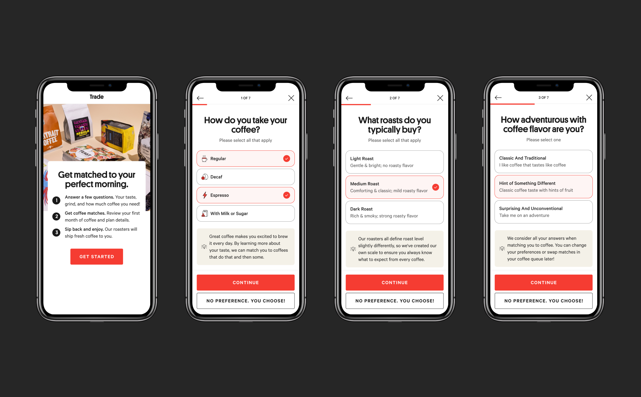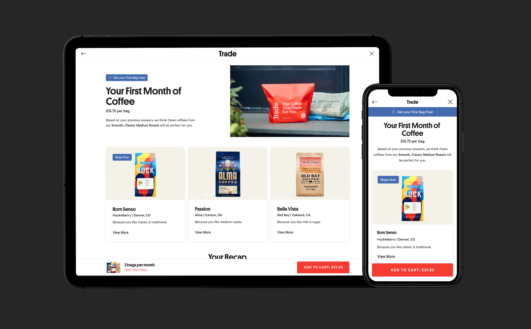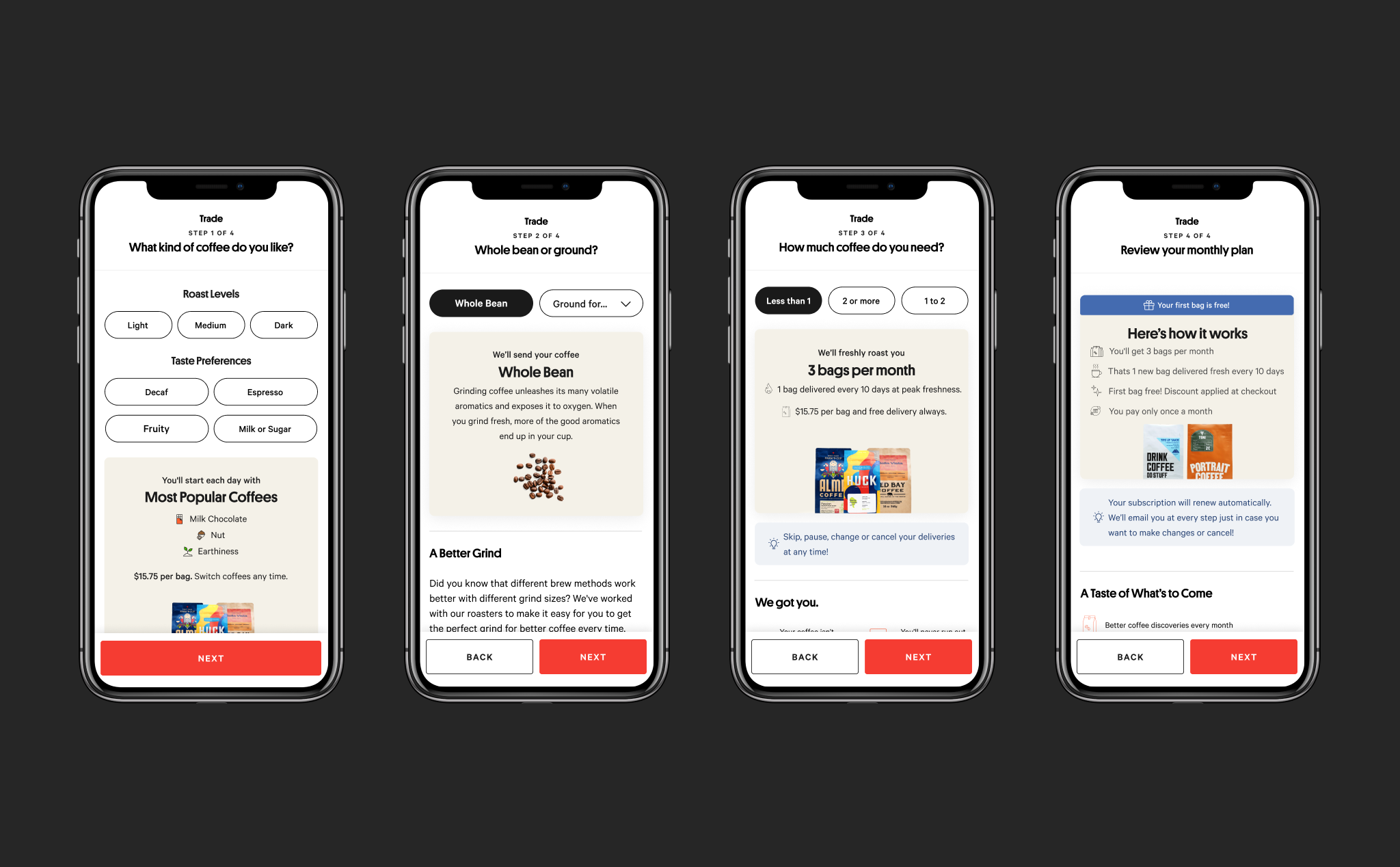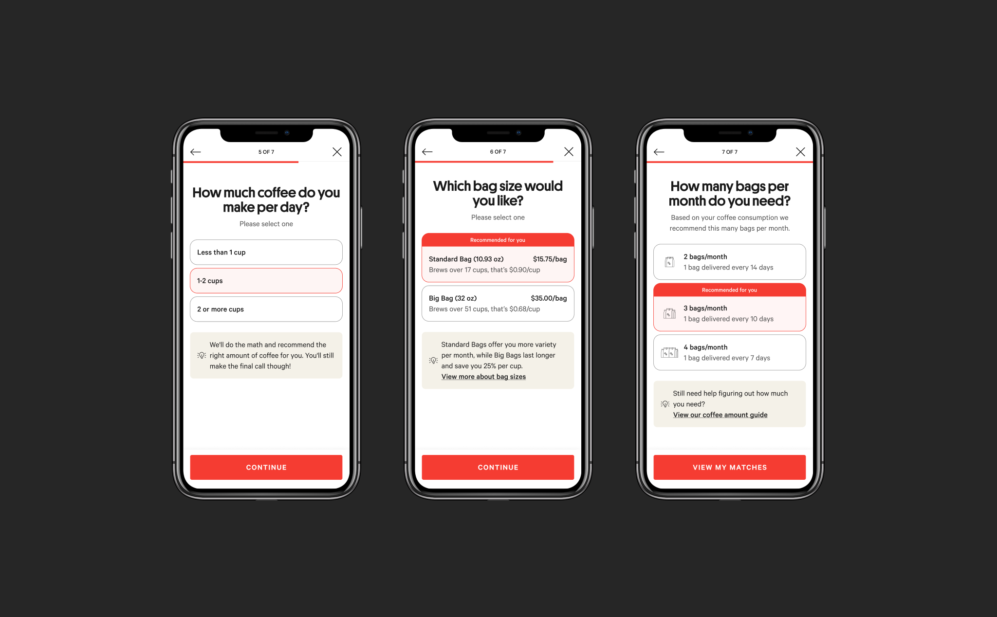 Improved design for product recommendation review screen, including individual coffee recommendations and why they match a user’s taste selections.