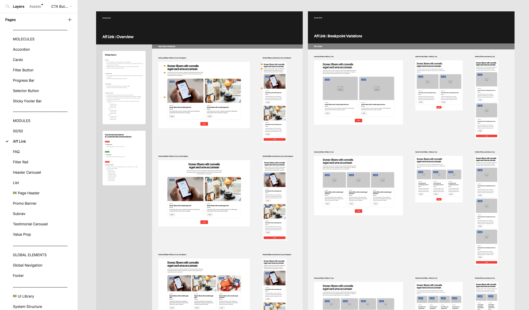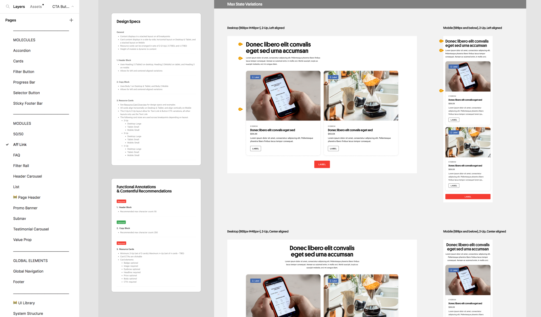 I created a working Figma file to house the system’s components and guidelines. The system consisted of multiple atoms and 11 content modules. Each element was documented with interactive and/or content states as well as breakpoints. Modules were also outlined with functional annotations and CMS content guidelines.